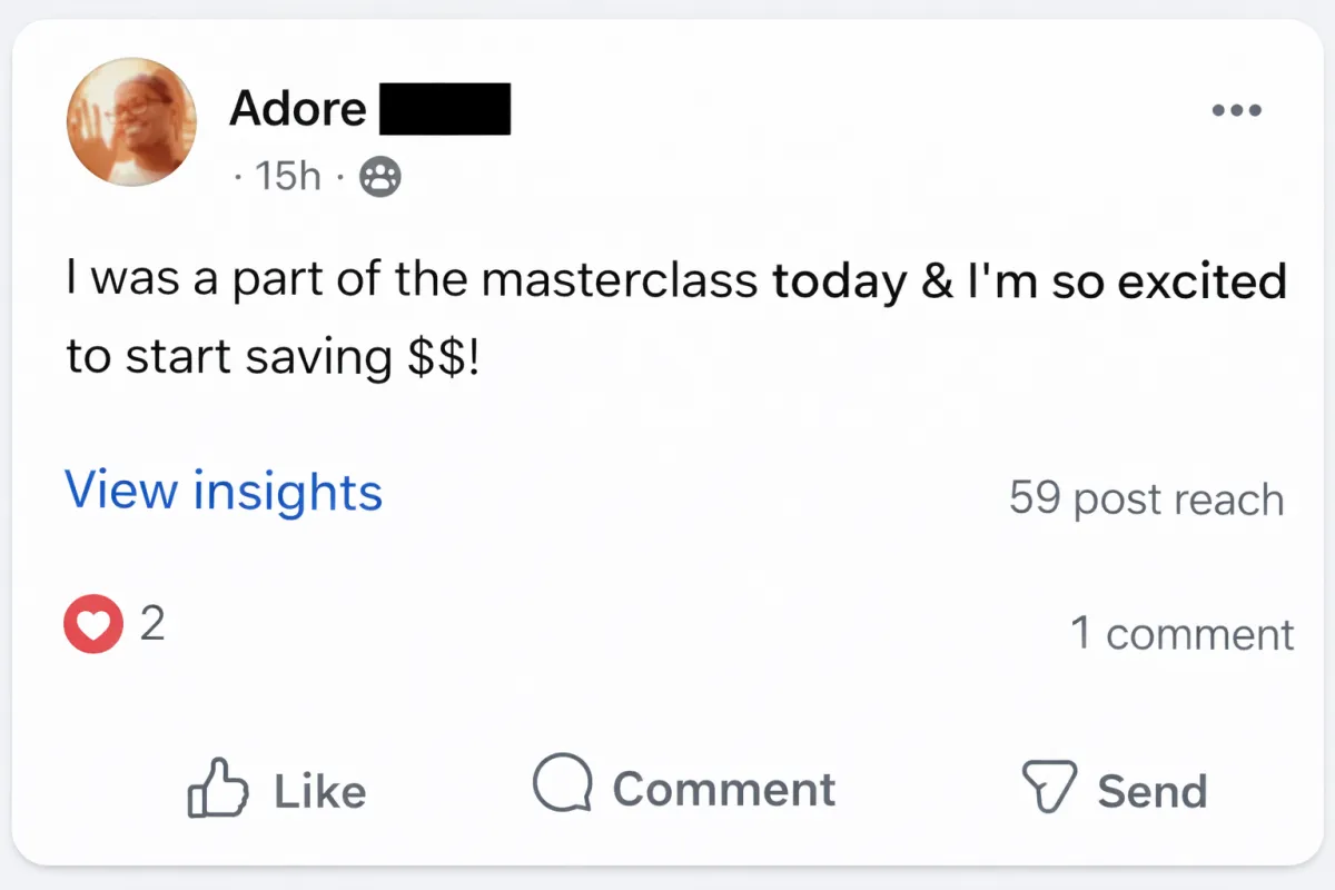 I created this workshop because I believe everyone deserves to stop living paycheck-to-paycheck, but most people don't have a simple system that actually works for busy life. My goal with this workshop is to provide you with the exact steps and proven strategies I've personally used to save $800+ per month and to empower as many families as possible to do the same.